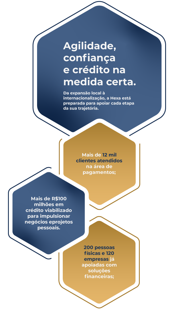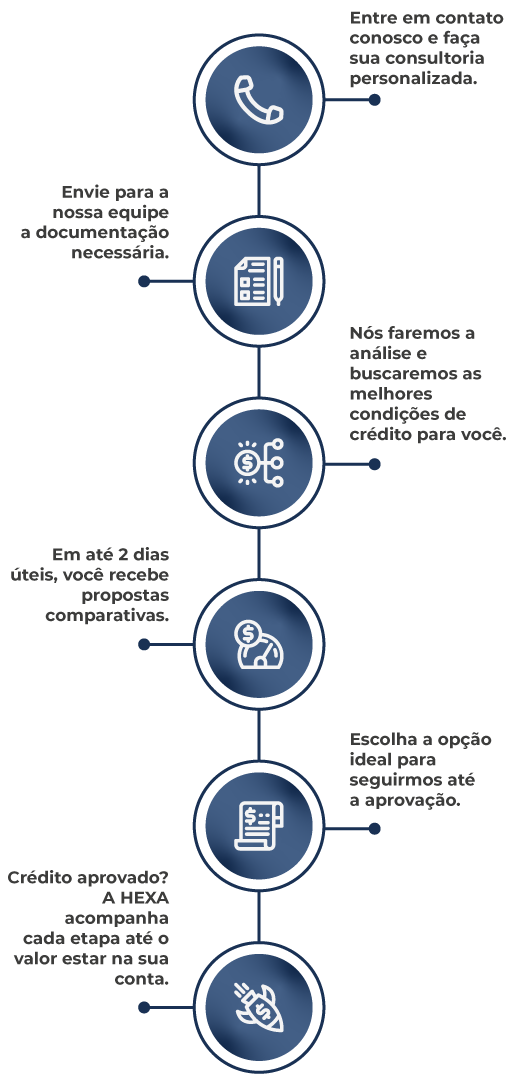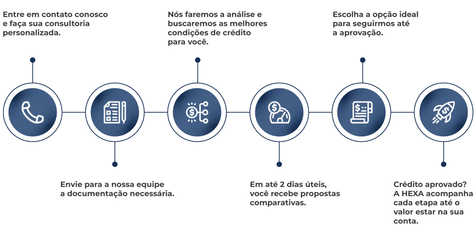 A Hexa cuida de tudo para você: desde a avaliação do perfil da empresa até a negociação com bancos e fundos. Você recebe propostas personalizadas, rápidas e sem custo inicial, com acompanhamento total até o crédito ser liberado.